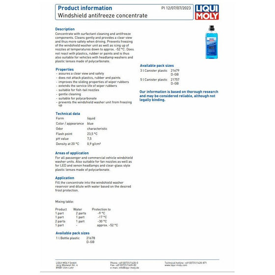 Window Antifreeze Concentrate -52°C is a state-of the-art formulation containing antifreeze and surfactant cleaning components designed for use in passenger and commercial vehicle windscreen washer units according to the mixture table. This product does not attack plastics and is therefore also suitable for vehicles with windscreen washer units made from polycarbonate.